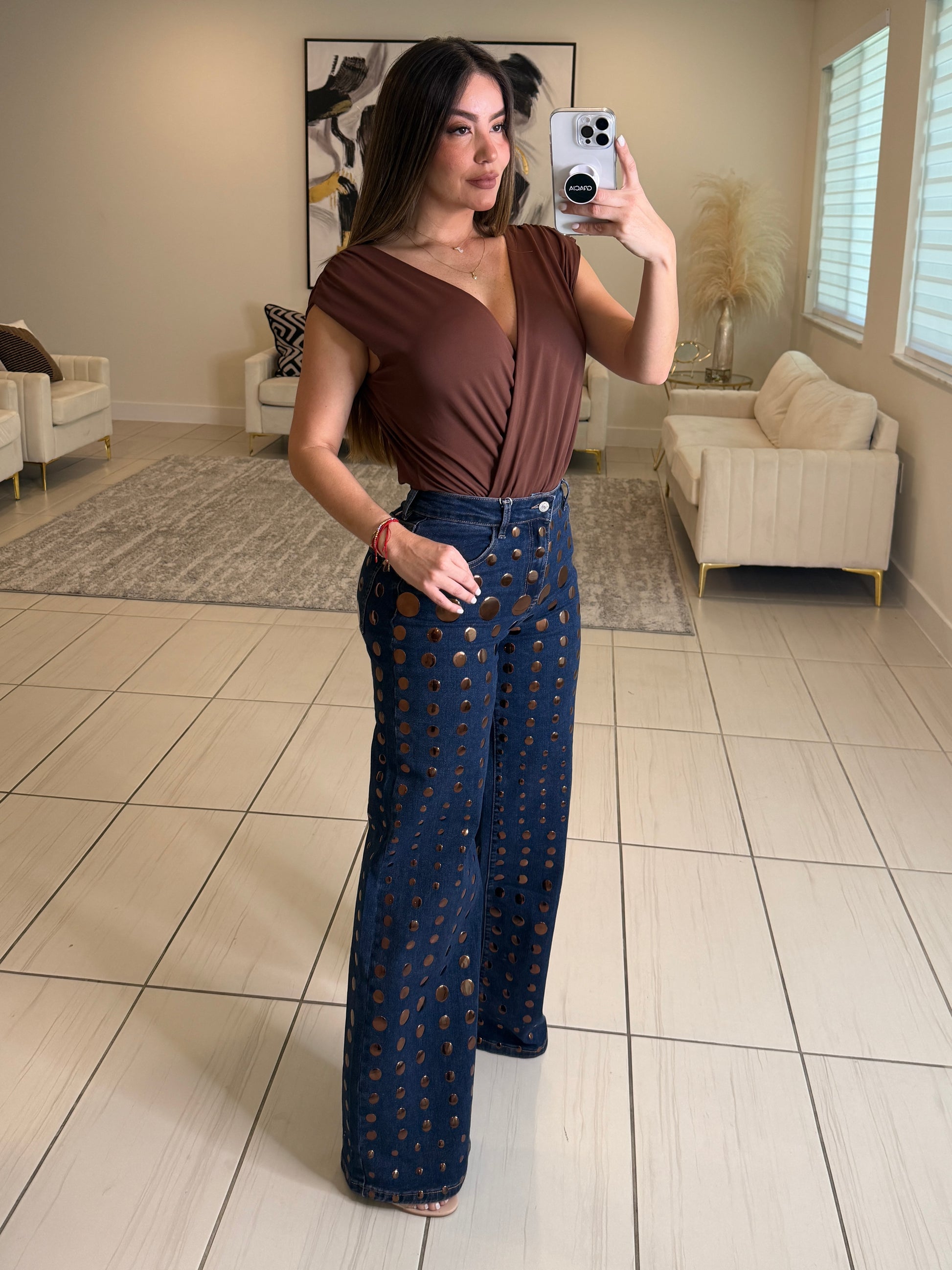 Bronze Shiny Polka Dots Denim Pants