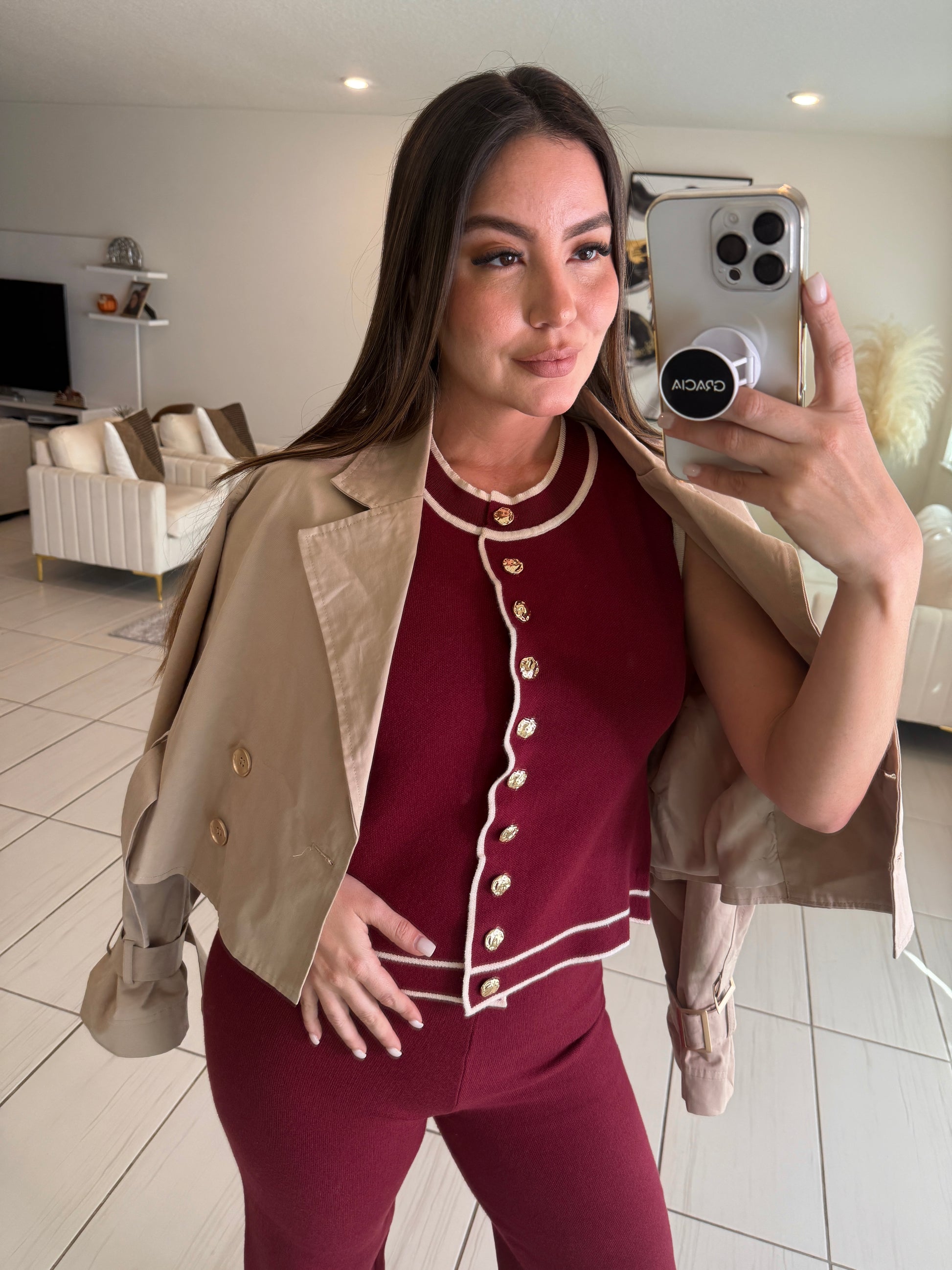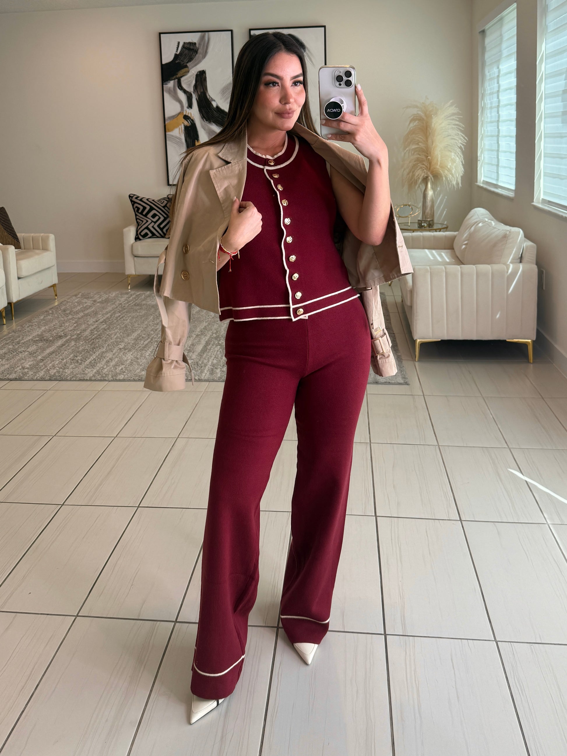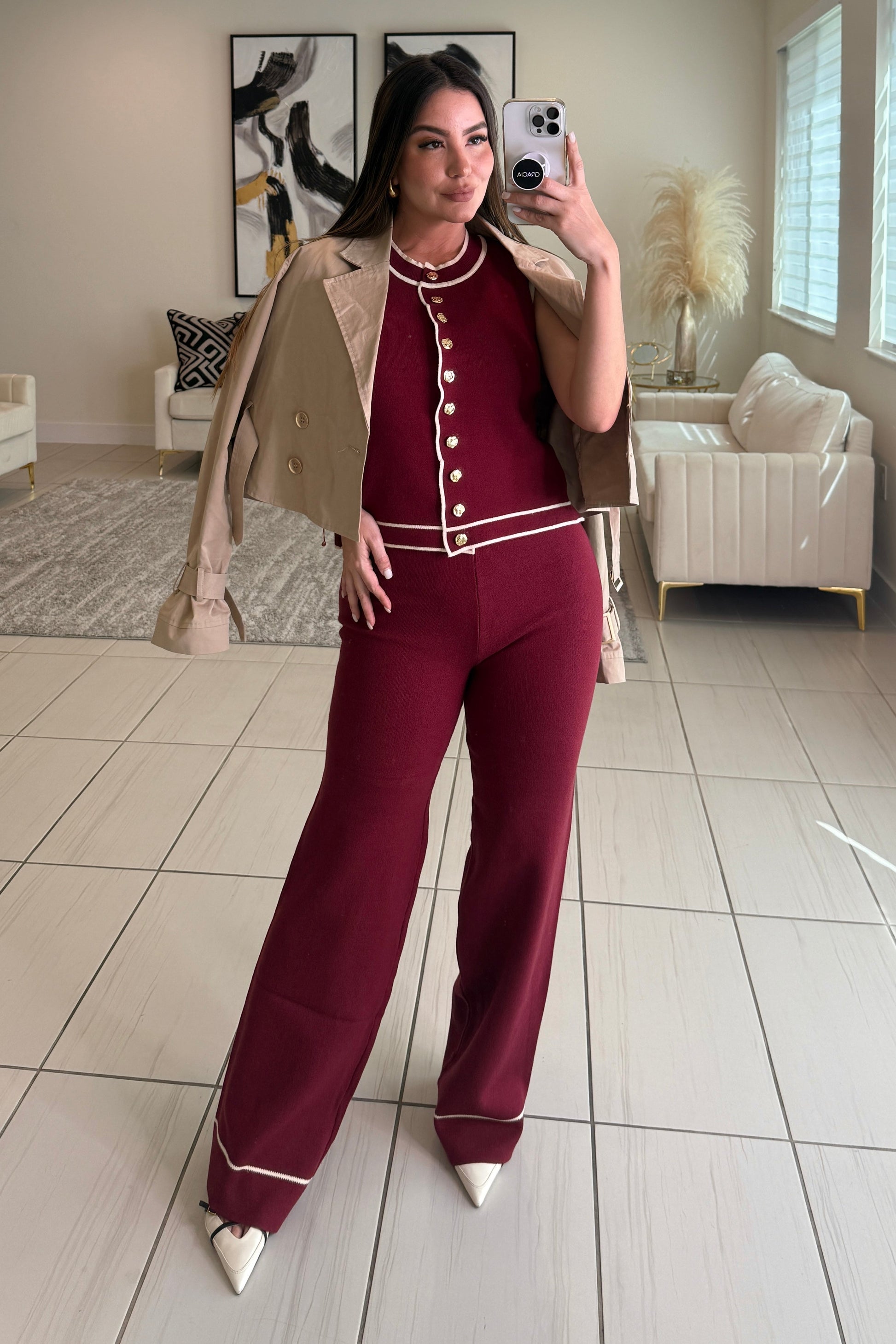 Experience effortless elegance with the Divine Knit Red Wine Pant Set, crafted for comfort and style. This rich red wine hue elevates your wardrobe, while the soft knit fabric ensures all-day ease. Perfect for both relaxed moments and polished outings, this set combines flattering fit with versatile appeal to make you feel confident and chic wherever you go.