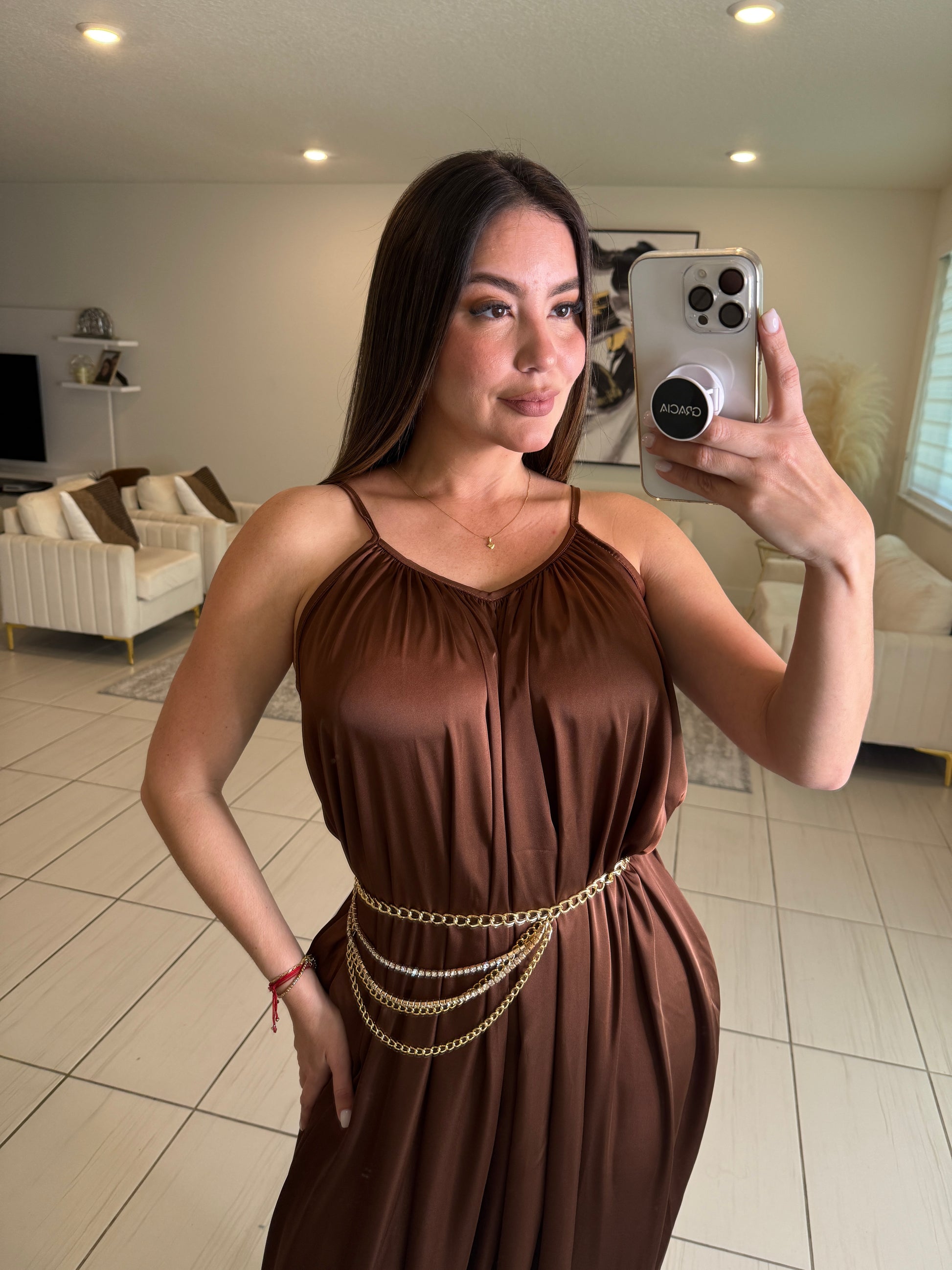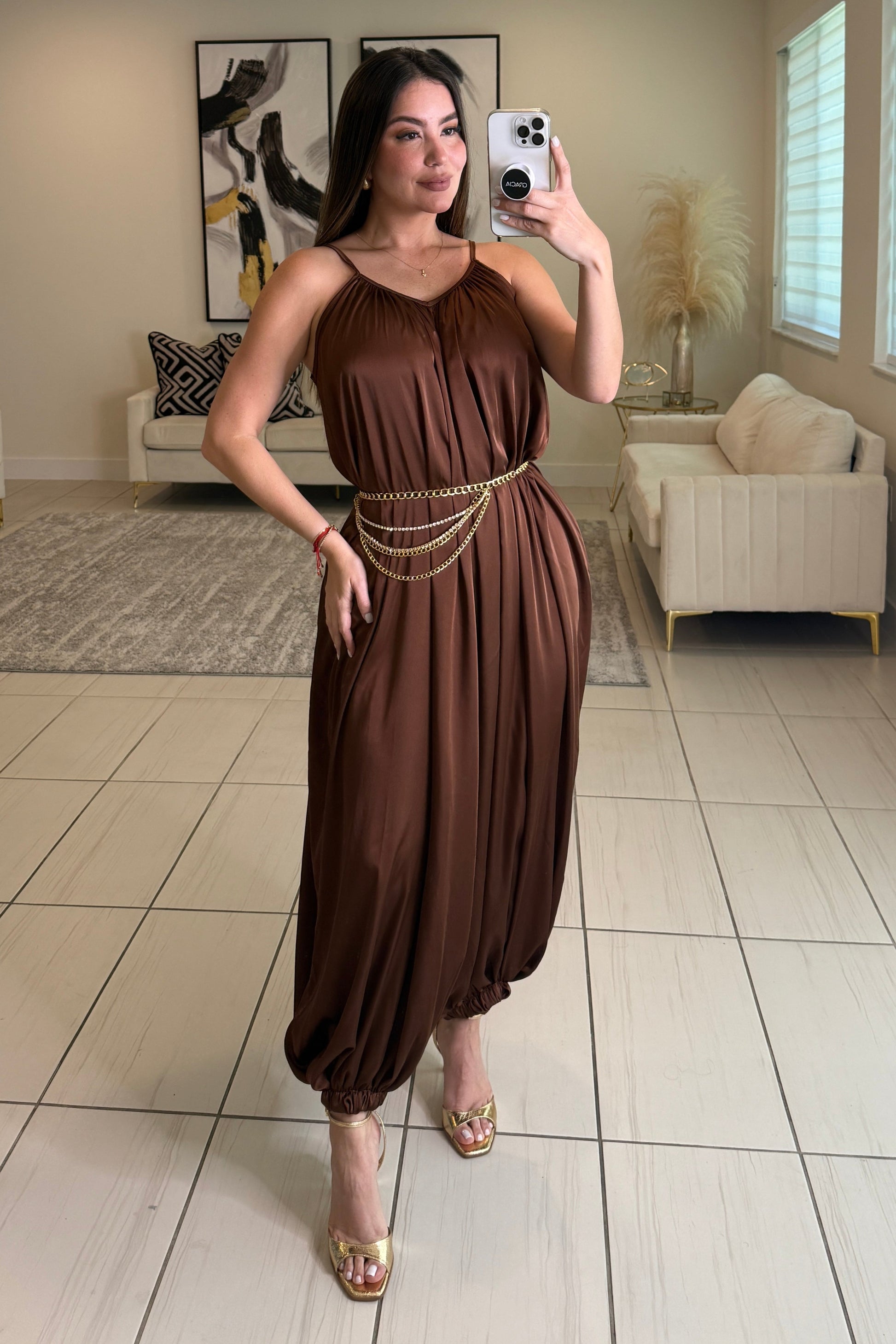 The Effortless Essence Ruched Brown Jumpsuit combines comfort with sophisticated style. Its flattering ruched design enhances your silhouette while the rich green hue adds a fresh, vibrant touch. Perfect for both casual outings and evening events, this jumpsuit offers ease of wear without sacrificing elegance. Make a confident statement with this versatile wardrobe essential.