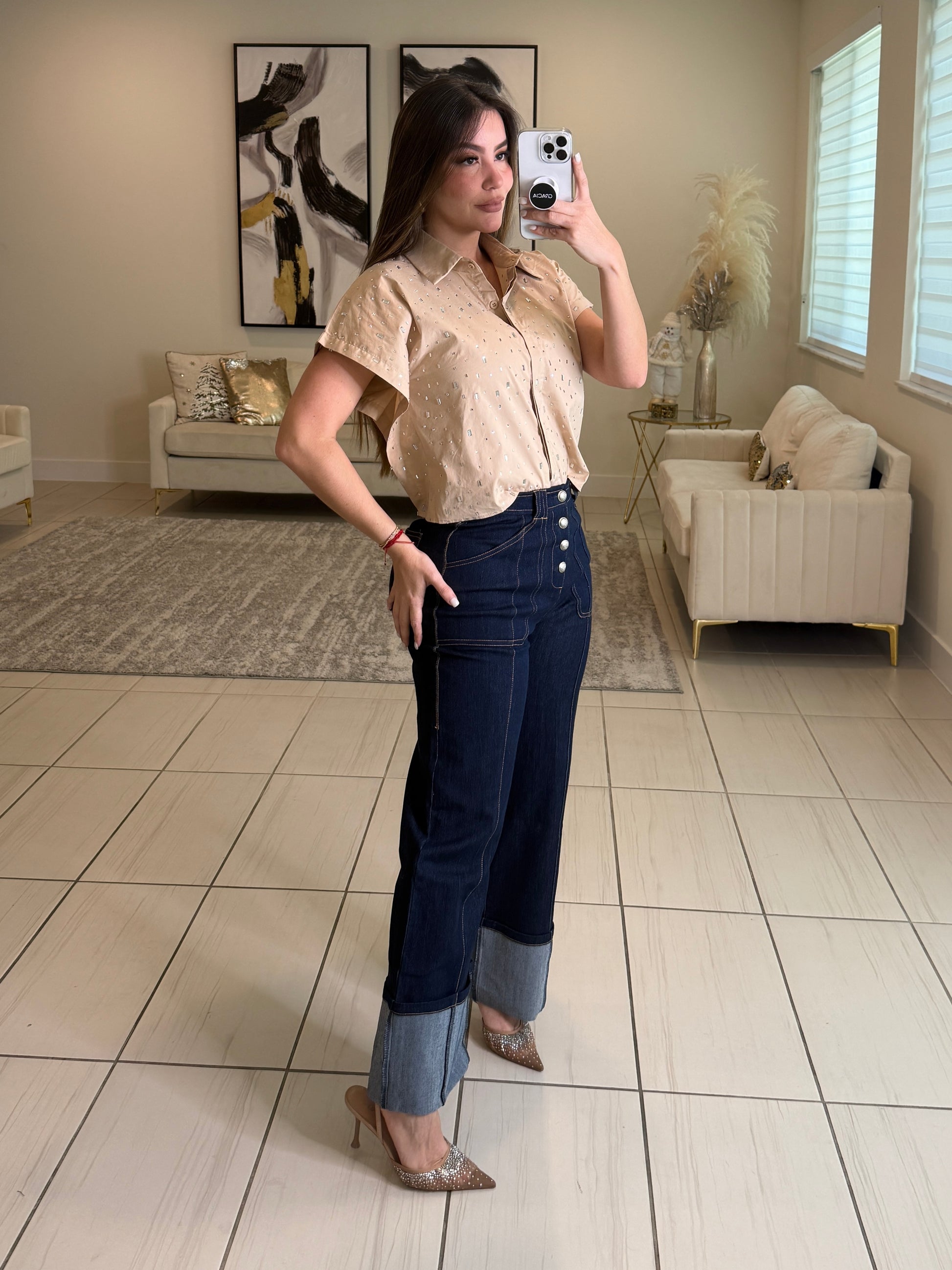 Elevate your everyday style with this stunning Frame Rhinestone Beige Top. Crafted in a versatile neutral shade, this piece features eye-catching rhinestone embellishments that add just the right amount of sparkle and sophistication. Perfect for transitioning from casual days to evening occasions, the beige tone pairs effortlessly with any wardrobe staple. Whether you're dressing up for a night out or adding glamour to your weekend look, this top delivers both comfort and undeniable style. Make a subtle yet memorable statement with rhinestone details that catch the light beautifully.