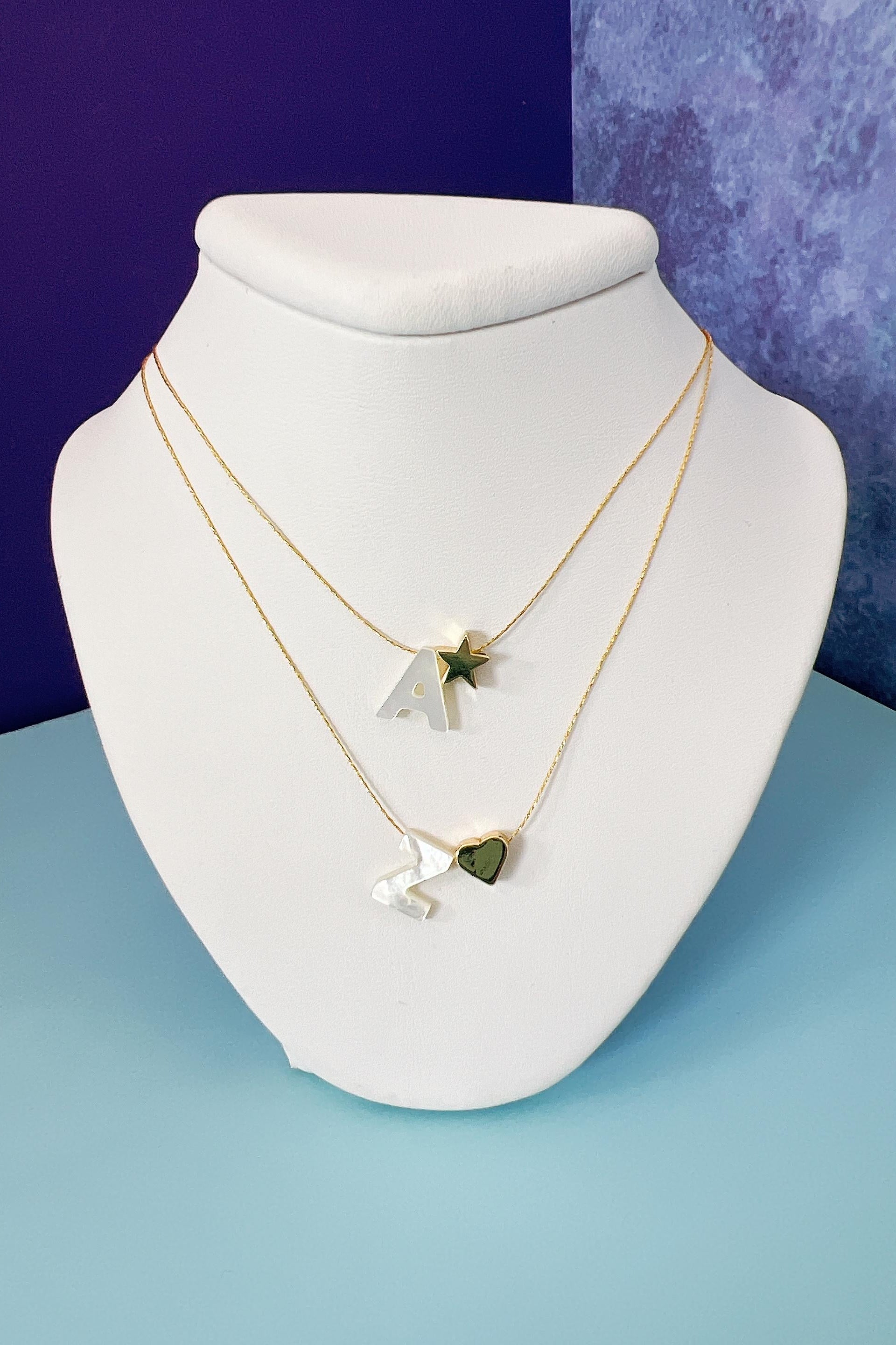Delicate and meaningful, these thread necklaces feature a shimmering mother-of-pearl initial paired with your choice of a gold-framed charm: a star or a heart in deep green enamel. Each piece is designed to reflect your individuality—whether you shine like a star or lead with your heart. Lightweight, elegant, and perfect for layering or wearing solo.