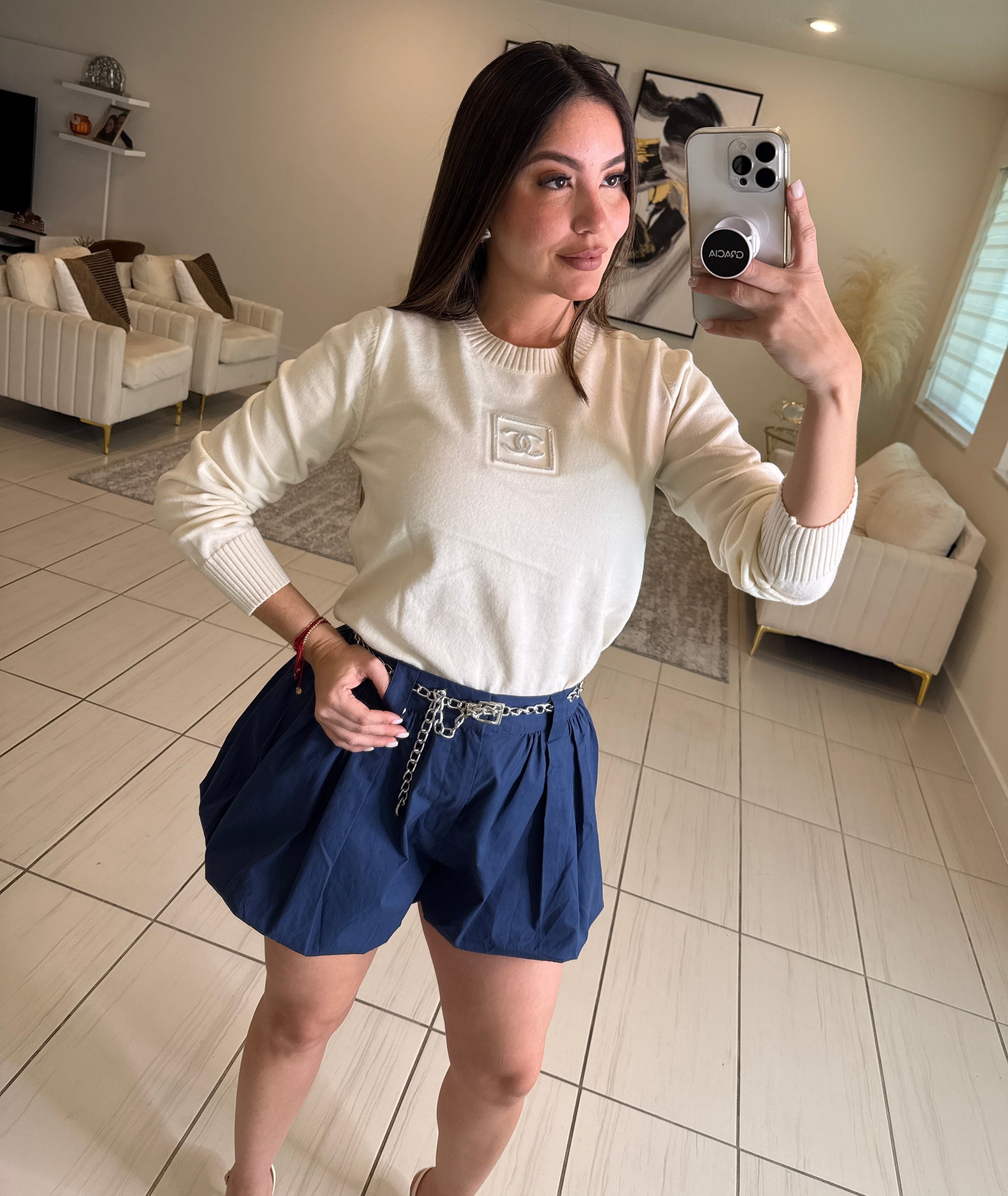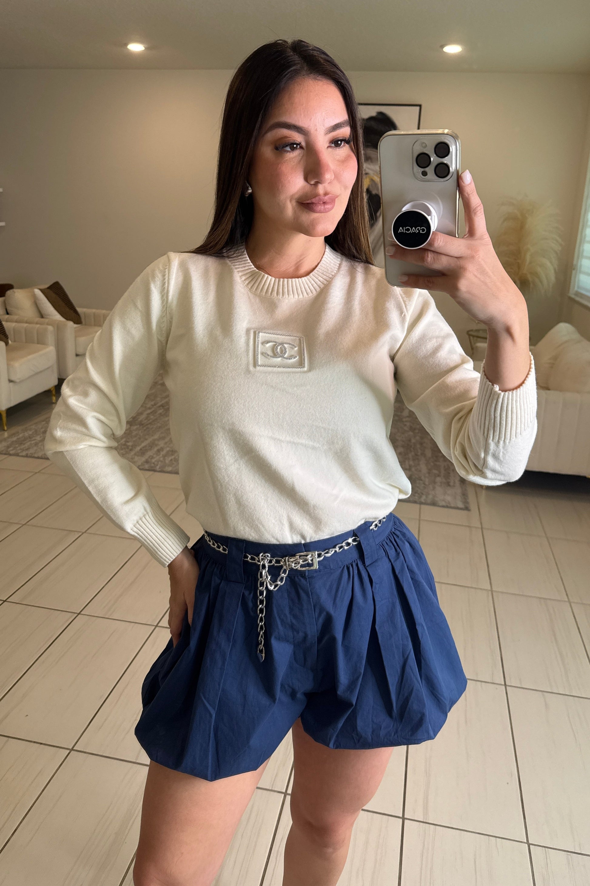Discover timeless elegance with the Iconic Pearls Knit Off White Top. Crafted from soft knit fabric, this sweater offers cozy comfort while the delicate pearl detailing adds a refined, luxurious touch. Perfect for elevating your everyday look or adding sophistication to special occasions, it’s a versatile piece that combines warmth and style effortlessly. Make this sweater the centerpiece of your wardrobe and enjoy lasting charm season after season.