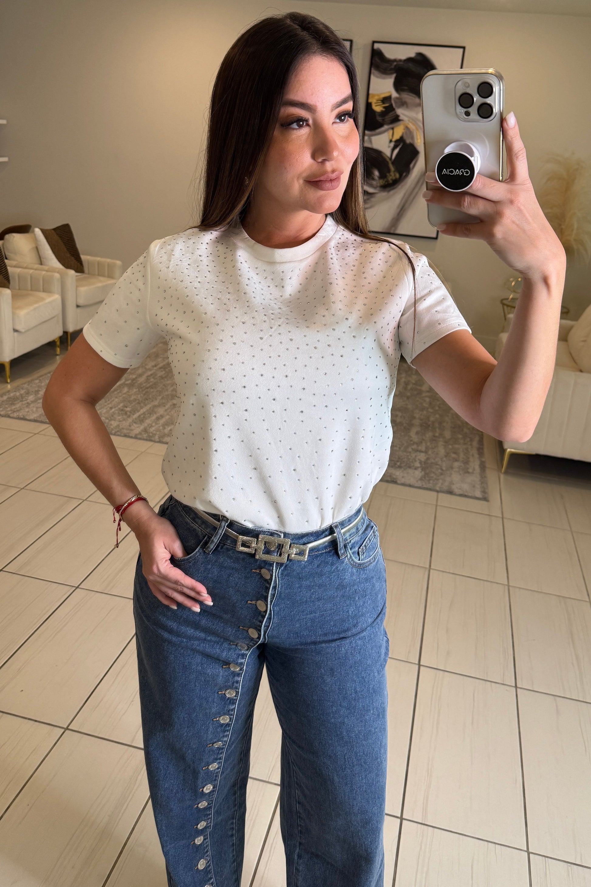 Elevate your style with the Rhinestones in Velvet White Top, where soft velvet meets sparkling rhinestones for a luxurious look. This top combines comfort and glamour, making it perfect for special occasions or adding a touch of elegance to your everyday outfit. Its rich texture and shimmering accents ensure you stand out effortlessly. Choose this top to feel confident, chic, and uniquely